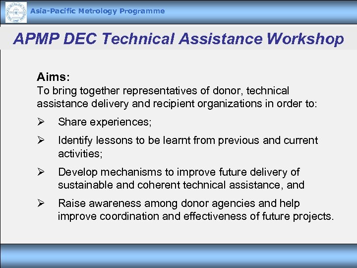 Asia-Pacific Metrology Programme APMP DEC Technical Assistance Workshop Aims: To bring together representatives of donor, technical assistance delivery and recipient organizations in order to: Ø Share experiences; Ø Identify lessons to be learnt from previous and current activities; Ø Develop mechanisms to improve future delivery of sustainable and coherent technical assistance, and Ø Raise awareness among donor agencies and help improve coordination and effectiveness of future projects.