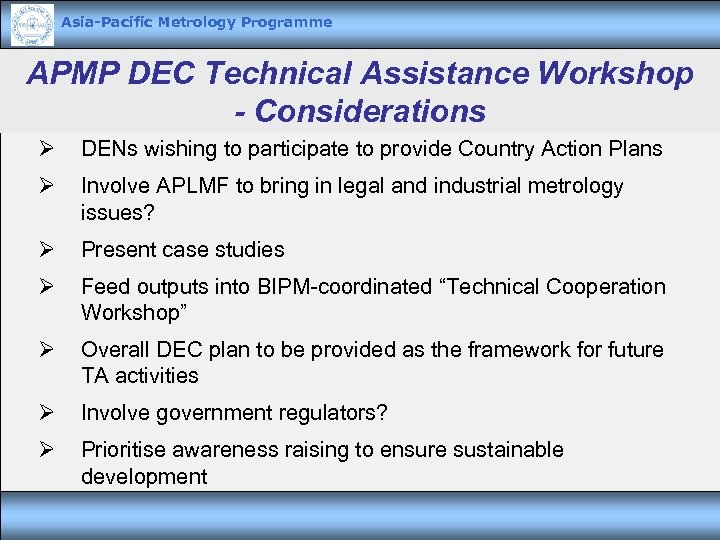 Asia-Pacific Metrology Programme APMP DEC Technical Assistance Workshop - Considerations Ø DENs wishing to participate to provide Country Action Plans Ø Involve APLMF to bring in legal and industrial metrology issues? Ø Present case studies Ø Feed outputs into BIPM-coordinated “Technical Cooperation Workshop” Ø Overall DEC plan to be provided as the framework for future TA activities Ø Involve government regulators? Ø Prioritise awareness raising to ensure sustainable development