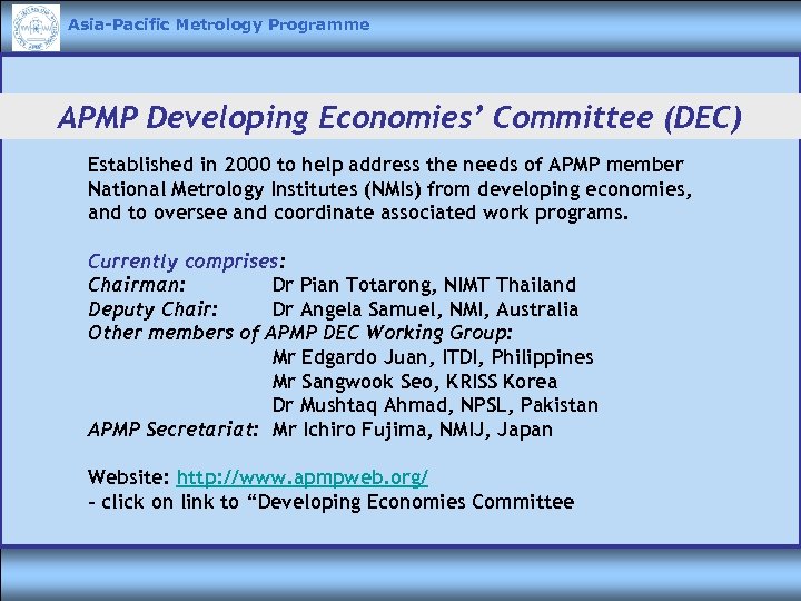 Asia-Pacific Metrology Programme APMP Developing Economies’ Committee (DEC) Established in 2000 to help address the needs of APMP member National Metrology Institutes (NMIs) from developing economies, and to oversee and coordinate associated work programs. Currently comprises: Chairman: Dr Pian Totarong, NIMT Thailand Deputy Chair: Dr Angela Samuel, NMI, Australia Other members of APMP DEC Working Group: Mr Edgardo Juan, ITDI, Philippines Mr Sangwook Seo, KRISS Korea Dr Mushtaq Ahmad, NPSL, Pakistan APMP Secretariat: Mr Ichiro Fujima, NMIJ, Japan Website: http: //www. apmpweb. org/ - click on link to “Developing Economies Committee