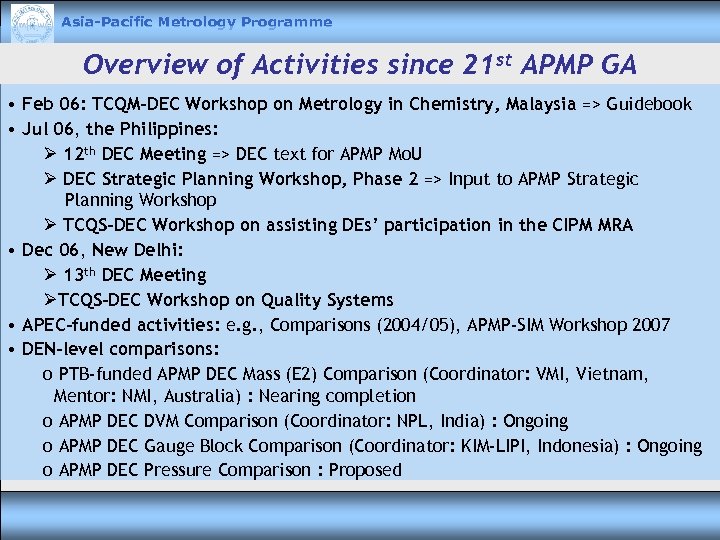 Asia-Pacific Metrology Programme Overview of Activities since 21 st APMP GA • Feb 06: TCQM-DEC Workshop on Metrology in Chemistry, Malaysia => Guidebook • Jul 06, the Philippines: Ø 12 th DEC Meeting => DEC text for APMP Mo. U Ø DEC Strategic Planning Workshop, Phase 2 => Input to APMP Strategic Planning Workshop Ø TCQS-DEC Workshop on assisting DEs’ participation in the CIPM MRA • Dec 06, New Delhi: Ø 13 th DEC Meeting ØTCQS-DEC Workshop on Quality Systems • APEC-funded activities: e. g. , Comparisons (2004/05), APMP-SIM Workshop 2007 • DEN-level comparisons: o PTB-funded APMP DEC Mass (E 2) Comparison (Coordinator: VMI, Vietnam, Mentor: NMI, Australia) : Nearing completion o APMP DEC DVM Comparison (Coordinator: NPL, India) : Ongoing o APMP DEC Gauge Block Comparison (Coordinator: KIM-LIPI, Indonesia) : Ongoing o APMP DEC Pressure Comparison : Proposed