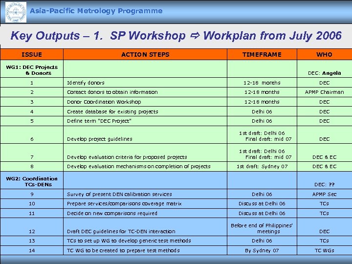 Asia-Pacific Metrology Programme Key Outputs – 1. SP Workshop Workplan from July 2006 ISSUE ACTION STEPS TIMEFRAME WHO WG 1: DEC Projects & Donors DEC: Angela 1 Identify donors 12 -18 months DEC 2 Contact donors to obtain information 12 -18 months APMP Chairman 3 Donor Coordination Workshop 12 -18 months DEC 4 Create database for existing projects Delhi 06 DEC 5 Define term "DEC Project" Delhi 06 DEC 6 Develop project guidelines 1 st draft: Delhi 06 Final draft: mid 07 DEC 7 Develop evaluation criteria for proposed projects 1 st draft: Delhi 06 Final draft: mid 07 DEC & EC 8 Develop evaluation mechanisms on completion of projects WG 2: Coordination TCs-DENs 9 Survey of present DEN calibration services 1 st draft: Sydney 07 DEC & EC DEC: ? ? Delhi 06 APMP Sec 10 Prepare services/comparisons coverage matrix Discuss at Delhi 06 TCs 11 Decide on new comparisons required Discuss at Delhi 06 TCs 12 Draft DEC guidelines for TC-DEN interaction Before end of Philippines' meetings DEC 13 TCs to set up WG to develop generic test methods Delhi 06 TCs 14 TC WG to be created to prepare test methods By Sydney 07 TC WGs