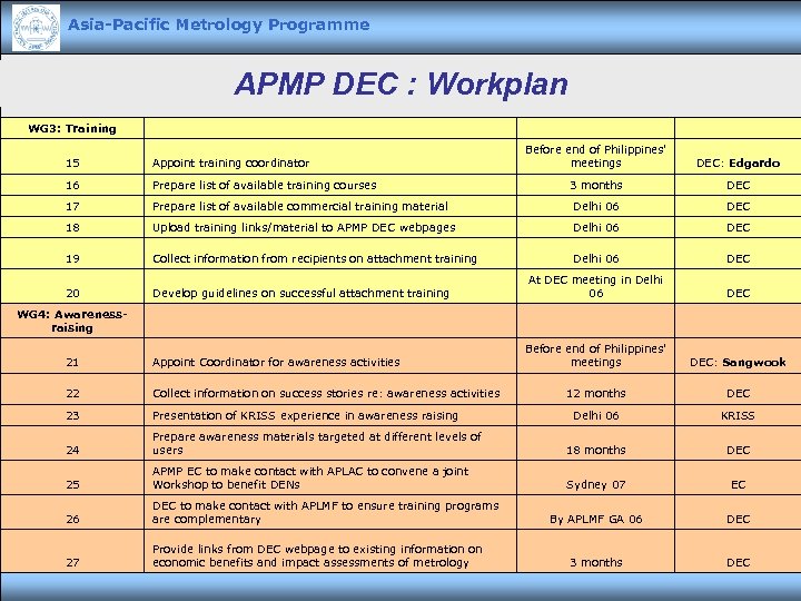 Asia-Pacific Metrology Programme APMP DEC : Workplan WG 3: Training Before end of Philippines' meetings DEC: Edgardo 15 Appoint training coordinator 16 Prepare list of available training courses 3 months DEC 17 Prepare list of available commercial training material Delhi 06 DEC 18 Upload training links/material to APMP DEC webpages Delhi 06 DEC 19 Collect information from recipients on attachment training Delhi 06 DEC 20 Develop guidelines on successful attachment training At DEC meeting in Delhi 06 DEC Before end of Philippines' meetings DEC: Sangwook 12 months DEC Delhi 06 KRISS WG 4: Awarenessraising 21 Appoint Coordinator for awareness activities 22 Collect information on success stories re: awareness activities 23 Presentation of KRISS experience in awareness raising 24 Prepare awareness materials targeted at different levels of users 18 months DEC 25 APMP EC to make contact with APLAC to convene a joint Workshop to benefit DENs Sydney 07 EC 26 DEC to make contact with APLMF to ensure training programs are complementary By APLMF GA 06 DEC 27 Provide links from DEC webpage to existing information on economic benefits and impact assessments of metrology 3 months DEC