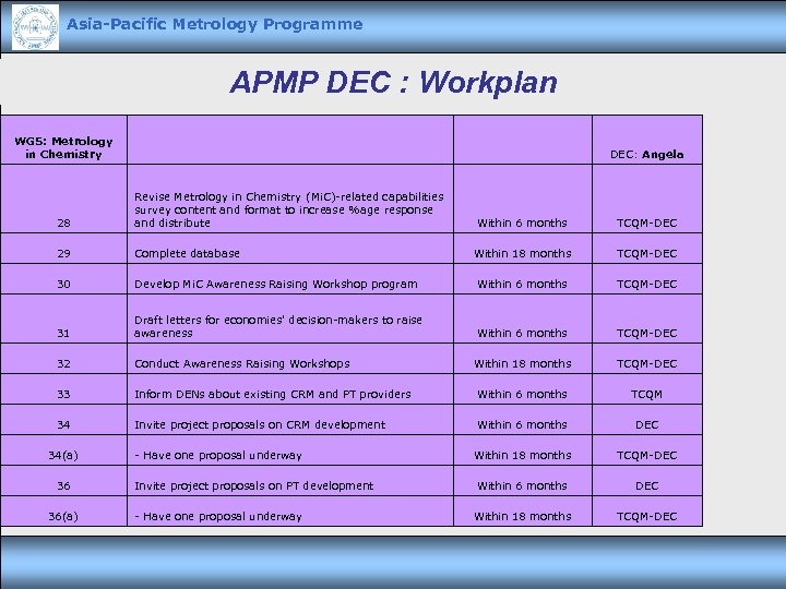 Asia-Pacific Metrology Programme APMP DEC : Workplan WG 5: Metrology in Chemistry DEC: Angela Within 6 months TCQM-DEC Within 18 months TCQM-DEC 28 Revise Metrology in Chemistry (Mi. C)-related capabilities survey content and format to increase %age response and distribute 29 Complete database 30 Develop Mi. C Awareness Raising Workshop program Within 6 months TCQM-DEC 31 Draft letters for economies' decision-makers to raise awareness Within 6 months TCQM-DEC 32 Conduct Awareness Raising Workshops Within 18 months TCQM-DEC 33 Inform DENs about existing CRM and PT providers Within 6 months TCQM 34 Invite project proposals on CRM development Within 6 months DEC Within 18 months TCQM-DEC 34(a) 36 36(a) - Have one proposal underway Invite project proposals on PT development - Have one proposal underway