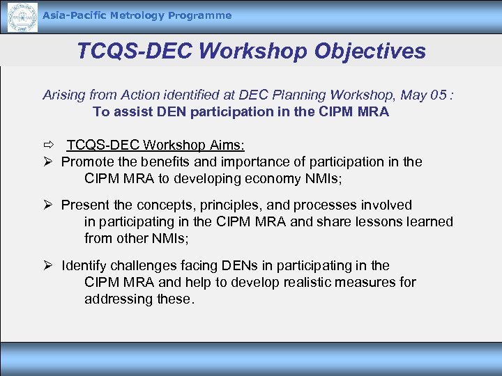 Asia-Pacific Metrology Programme TCQS-DEC Workshop Objectives Arising from Action identified at DEC Planning Workshop, May 05 : To assist DEN participation in the CIPM MRA TCQS-DEC Workshop Aims: Ø Promote the benefits and importance of participation in the CIPM MRA to developing economy NMIs; Ø Present the concepts, principles, and processes involved in participating in the CIPM MRA and share lessons learned from other NMIs; Ø Identify challenges facing DENs in participating in the CIPM MRA and help to develop realistic measures for addressing these.
