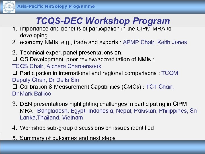 Asia-Pacific Metrology Programme TCQS-DEC Workshop Program 1. Importance and benefits of participation in the CIPM MRA to developing 2. economy NMIs, e. g. , trade and exports : APMP Chair, Keith Jones 2. Technical expert panel presentations on: q QS Development, peer review/accreditation of NMIs : TCQS Chair, Ajchara Charoensook q Participation in international and regional comparisons : TCQM Deputy Chair, Dr Della Sin q Calibration & Measurement Capabilities (CMCs) : TCT Chair, Dr Mark Ballico 3. DEN presentations highlighting challenges in participating in CIPM MRA : Bangladesh, Egypt, Indonesia, Nepal, Pakistan, Philippines, Sri Lanka, Thailand, Vietnam 4. Workshop sub-group discussions on issues identified 5. Summary of outcomes and next steps