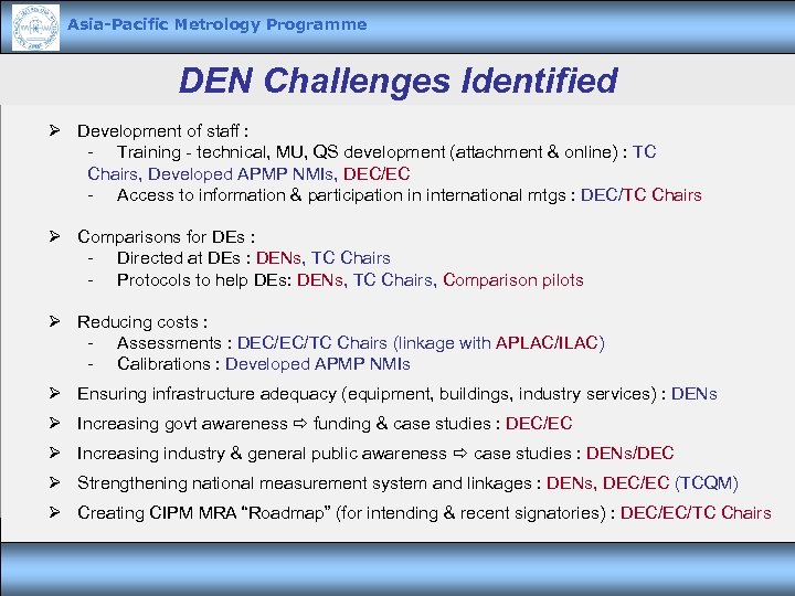 Asia-Pacific Metrology Programme DEN Challenges Identified Ø Development of staff : - Training - technical, MU, QS development (attachment & online) : TC Chairs, Developed APMP NMIs, DEC/EC - Access to information & participation in international mtgs : DEC/TC Chairs Ø Comparisons for DEs : - Directed at DEs : DENs, TC Chairs - Protocols to help DEs: DENs, TC Chairs, Comparison pilots Ø Reducing costs : - Assessments : DEC/EC/TC Chairs (linkage with APLAC/ILAC) - Calibrations : Developed APMP NMIs Ø Ensuring infrastructure adequacy (equipment, buildings, industry services) : DENs Ø Increasing govt awareness funding & case studies : DEC/EC Ø Increasing industry & general public awareness case studies : DENs/DEC Ø Strengthening national measurement system and linkages : DENs, DEC/EC (TCQM) Ø Creating CIPM MRA “Roadmap” (for intending & recent signatories) : DEC/EC/TC Chairs