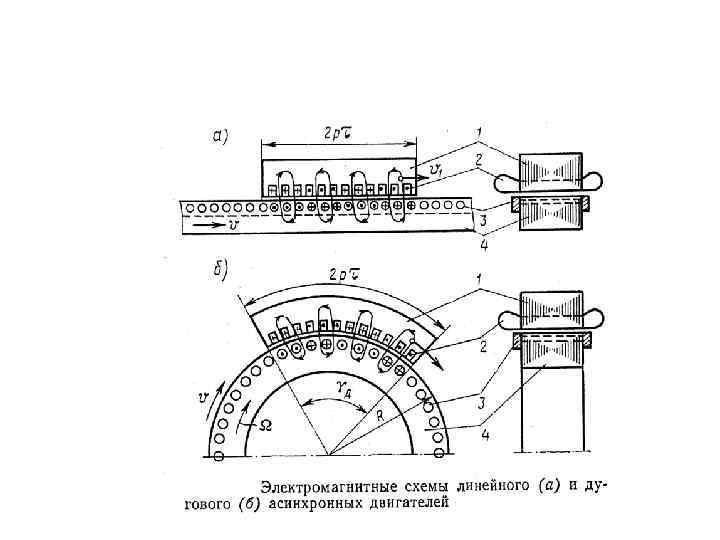 где n 01 — синхронная частота вращения обычного (до «разрезания» ) асинхронного двигателя, об/мин; α — угол дуги статора, рад. Из (1) следует, что, изменяя угол α, можно получить дуговой асинхронный двигатель на любую синхронную частоту меньше частоты вращения n 01. Дуговые двигатели применяют для безредукторного привода устройств, требующих небольших частот вращения, исключив применение сложного и трудоемкого редуктора. Если же «разрезанный» статор развернуть в плоскость, то получим асинхронный линейный двигатель (ЛАД) (рис. 1, в).