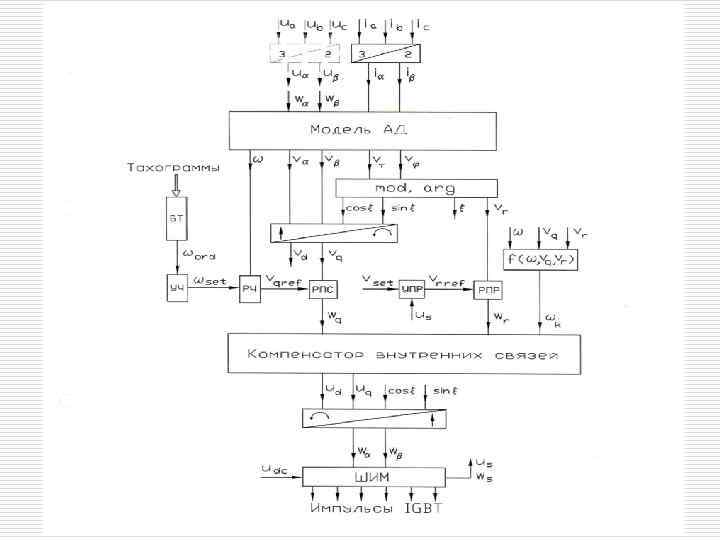Уравнения асинхронной машины с короткозамкнутым ротором Ψg = Ψr; Ψh≡ 0; pΨh≡ 0; (70) Mel = kr Ψr iq; (71) (72) (73) (74)