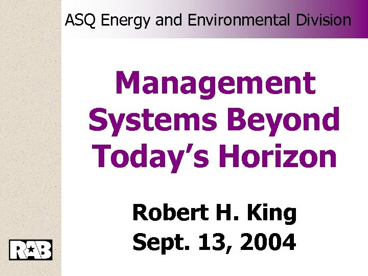 ASQ Energy and Environmental Division Management Systems Beyond Today’s Horizon Robert H. King Sept. 13, 2004