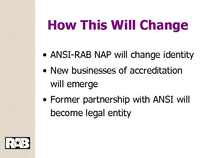 How This Will Change • ANSI-RAB NAP will change identity • New businesses of accreditation will emerge • Former partnership with ANSI will become legal entity