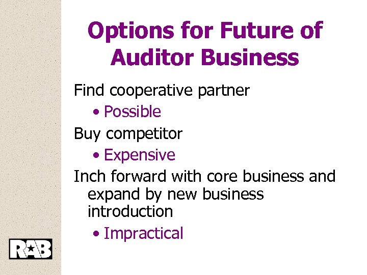 Options for Future of Auditor Business Find cooperative partner • Possible Buy competitor • Expensive Inch forward with core business and expand by new business introduction • Impractical
