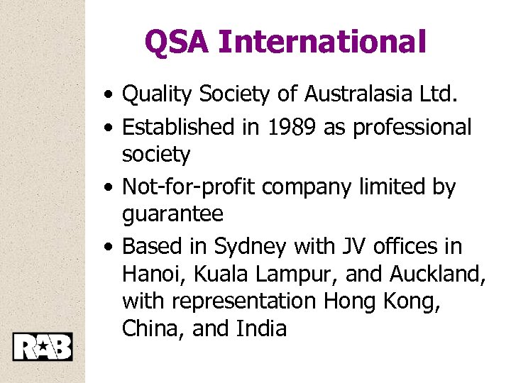 QSA International • Quality Society of Australasia Ltd. • Established in 1989 as professional society • Not-for-profit company limited by guarantee • Based in Sydney with JV offices in Hanoi, Kuala Lampur, and Auckland, with representation Hong Kong, China, and India