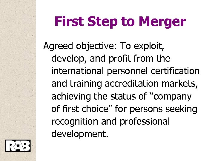 First Step to Merger Agreed objective: To exploit, develop, and profit from the international personnel certification and training accreditation markets, achieving the status of “company of first choice” for persons seeking recognition and professional development.