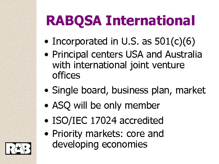 RABQSA International • Incorporated in U. S. as 501(c)(6) • Principal centers USA and Australia with international joint venture offices • Single board, business plan, market • ASQ will be only member • ISO/IEC 17024 accredited • Priority markets: core and developing economies