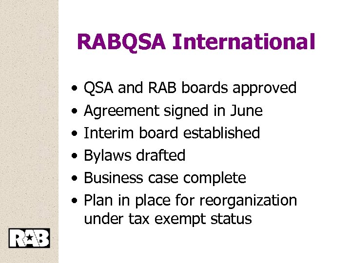 RABQSA International • • • QSA and RAB boards approved Agreement signed in June Interim board established Bylaws drafted Business case complete Plan in place for reorganization under tax exempt status