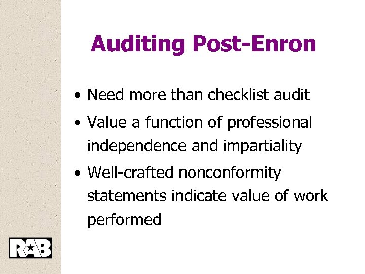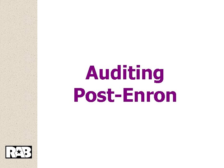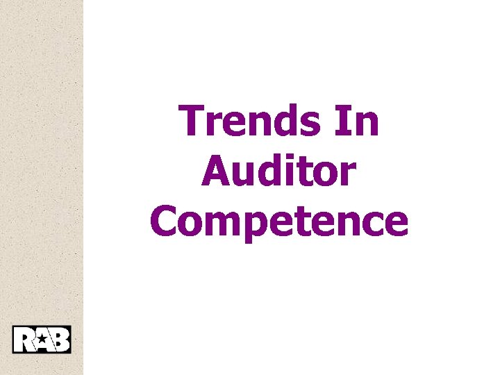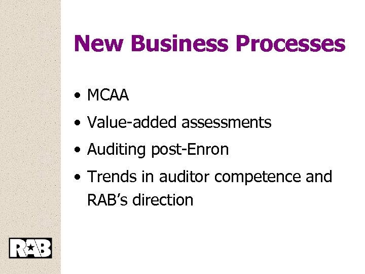 New Business Processes • MCAA • Value-added assessments • Auditing post-Enron • Trends in auditor competence and RAB’s direction