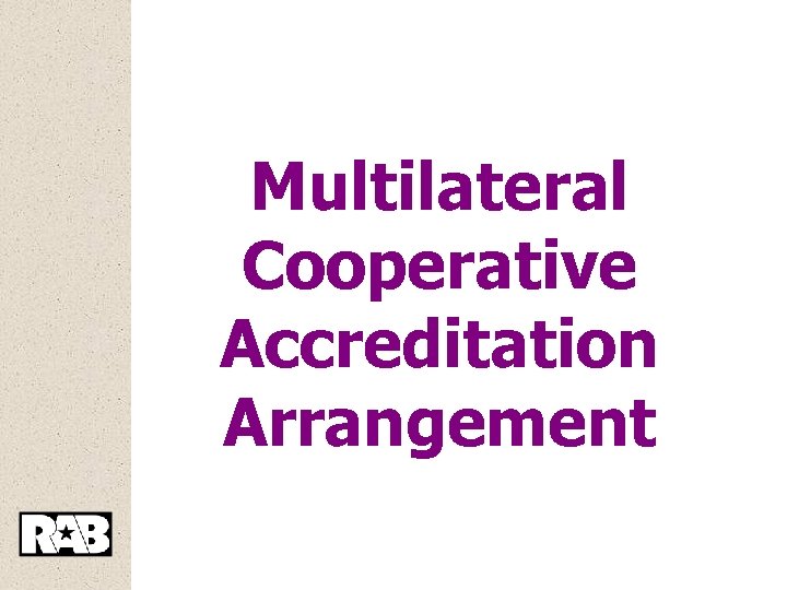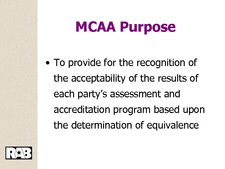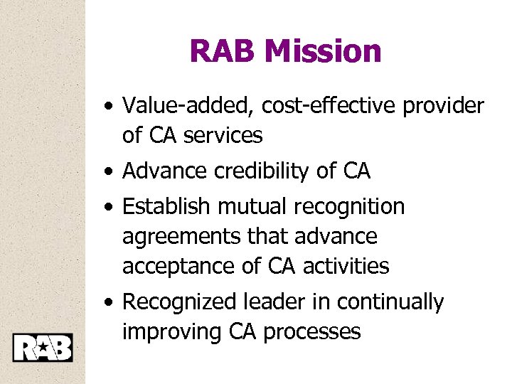 RAB Mission • Value-added, cost-effective provider of CA services • Advance credibility of CA • Establish mutual recognition agreements that advance acceptance of CA activities • Recognized leader in continually improving CA processes
