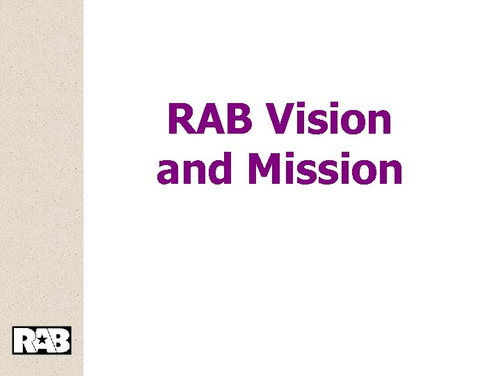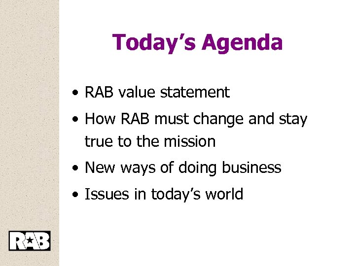 Today’s Agenda • RAB value statement • How RAB must change and stay true to the mission • New ways of doing business • Issues in today’s world
