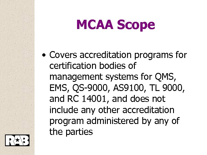 MCAA Scope • Covers accreditation programs for certification bodies of management systems for QMS, EMS, QS-9000, AS 9100, TL 9000, and RC 14001, and does not include any other accreditation program administered by any of the parties