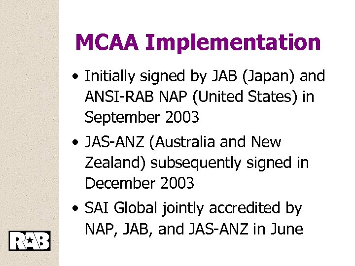 MCAA Implementation • Initially signed by JAB (Japan) and ANSI-RAB NAP (United States) in September 2003 • JAS-ANZ (Australia and New Zealand) subsequently signed in December 2003 • SAI Global jointly accredited by NAP, JAB, and JAS-ANZ in June