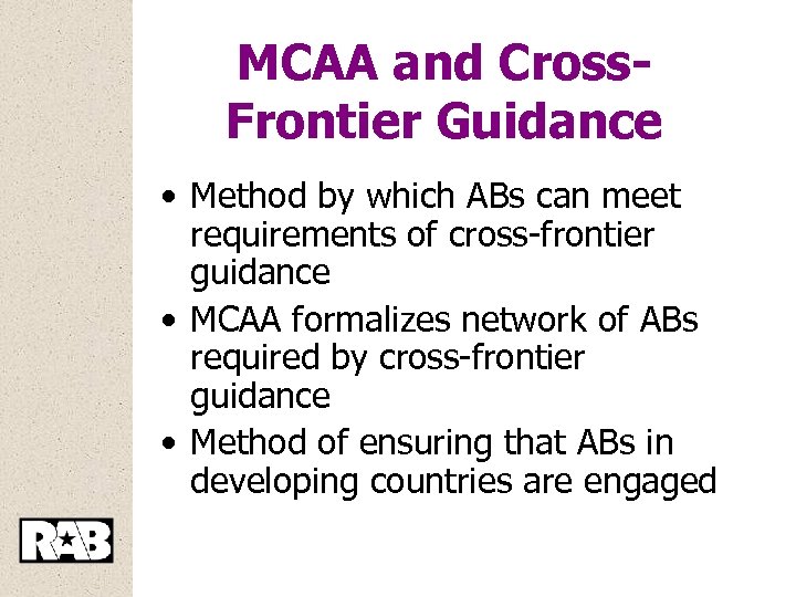 MCAA and Cross. Frontier Guidance • Method by which ABs can meet requirements of cross-frontier guidance • MCAA formalizes network of ABs required by cross-frontier guidance • Method of ensuring that ABs in developing countries are engaged