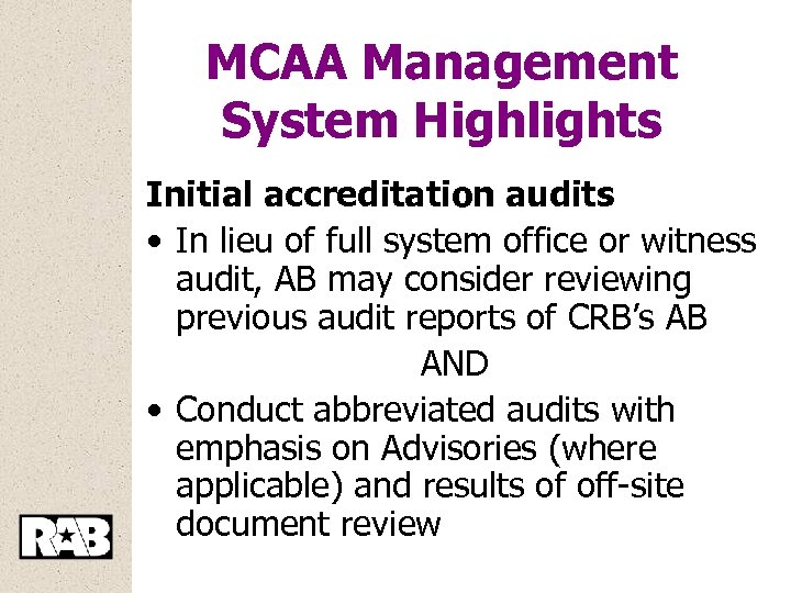 MCAA Management System Highlights Initial accreditation audits • In lieu of full system office or witness audit, AB may consider reviewing previous audit reports of CRB’s AB AND • Conduct abbreviated audits with emphasis on Advisories (where applicable) and results of off-site document review
