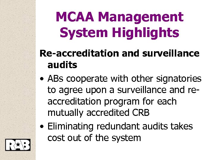 MCAA Management System Highlights Re-accreditation and surveillance audits • ABs cooperate with other signatories to agree upon a surveillance and reaccreditation program for each mutually accredited CRB • Eliminating redundant audits takes cost out of the system