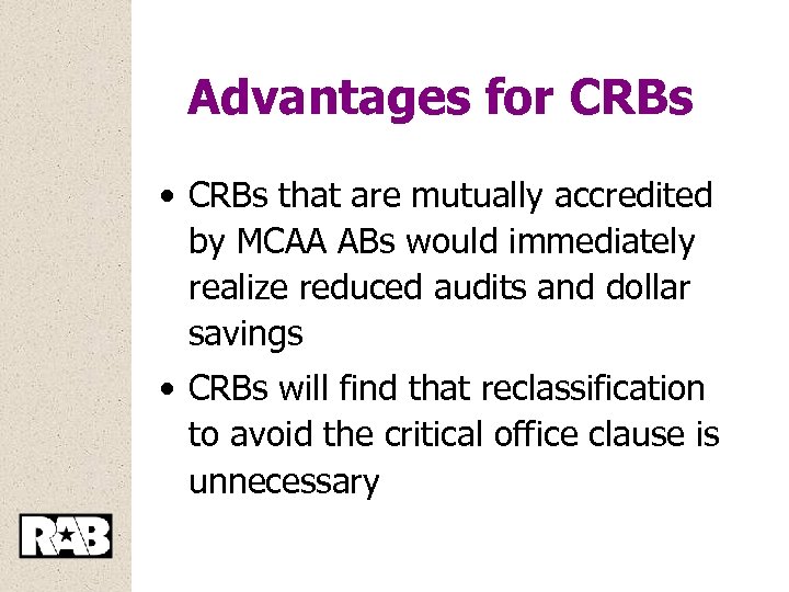 Advantages for CRBs • CRBs that are mutually accredited by MCAA ABs would immediately realize reduced audits and dollar savings • CRBs will find that reclassification to avoid the critical office clause is unnecessary