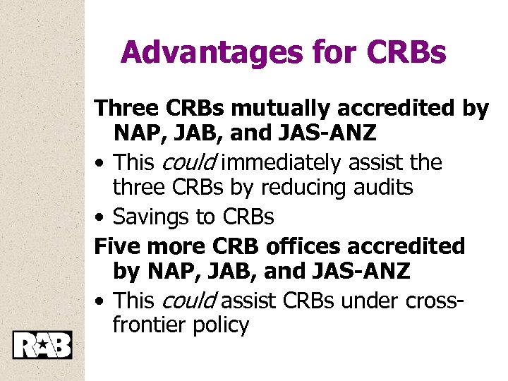 Advantages for CRBs Three CRBs mutually accredited by NAP, JAB, and JAS-ANZ • This could immediately assist the three CRBs by reducing audits • Savings to CRBs Five more CRB offices accredited by NAP, JAB, and JAS-ANZ • This could assist CRBs under crossfrontier policy