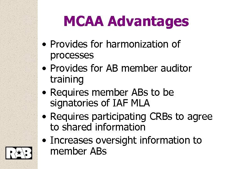 MCAA Advantages • Provides for harmonization of processes • Provides for AB member auditor training • Requires member ABs to be signatories of IAF MLA • Requires participating CRBs to agree to shared information • Increases oversight information to member ABs