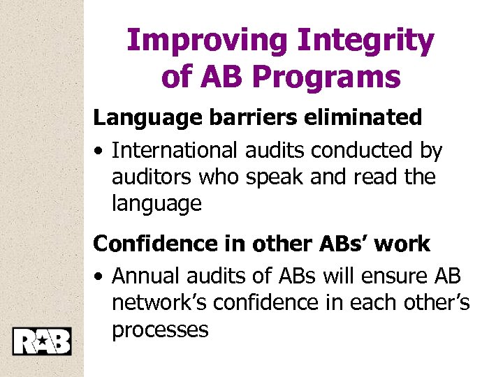 Improving Integrity of AB Programs Language barriers eliminated • International audits conducted by auditors who speak and read the language Confidence in other ABs’ work • Annual audits of ABs will ensure AB network’s confidence in each other’s processes