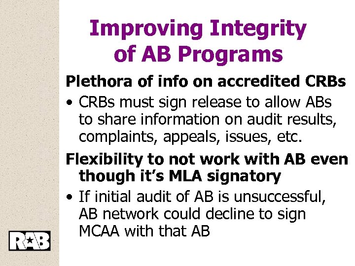 Improving Integrity of AB Programs Plethora of info on accredited CRBs • CRBs must sign release to allow ABs to share information on audit results, complaints, appeals, issues, etc. Flexibility to not work with AB even though it’s MLA signatory • If initial audit of AB is unsuccessful, AB network could decline to sign MCAA with that AB