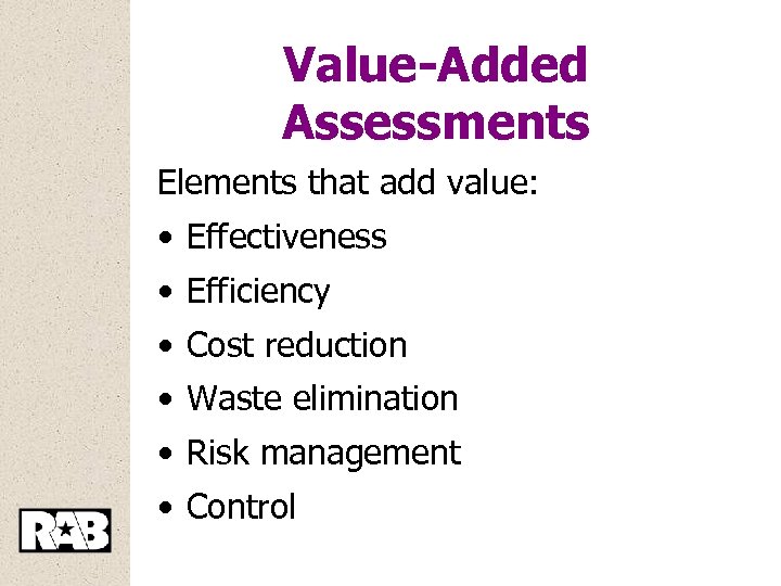 Value-Added Assessments Elements that add value: • Effectiveness • Efficiency • Cost reduction • Waste elimination • Risk management • Control