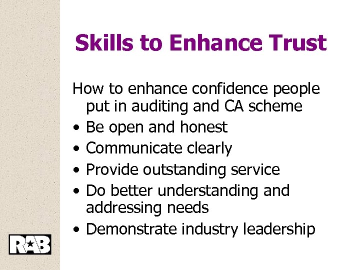 Skills to Enhance Trust How to enhance confidence people put in auditing and CA scheme • Be open and honest • Communicate clearly • Provide outstanding service • Do better understanding and addressing needs • Demonstrate industry leadership