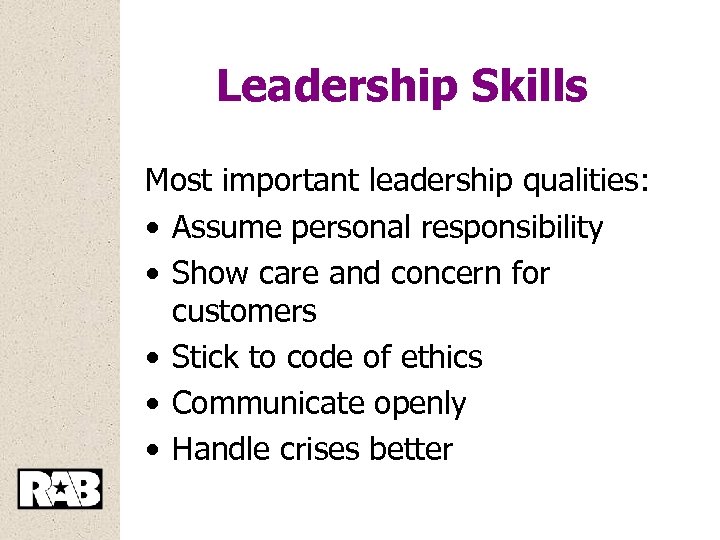 Leadership Skills Most important leadership qualities: • Assume personal responsibility • Show care and concern for customers • Stick to code of ethics • Communicate openly • Handle crises better