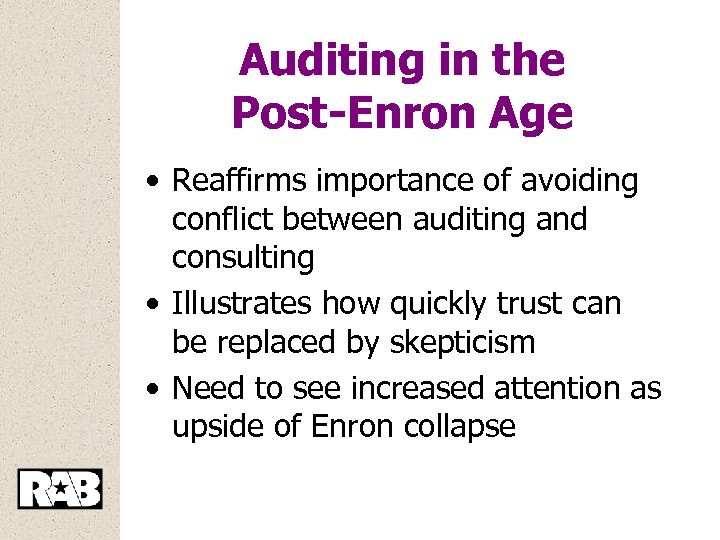 Auditing in the Post-Enron Age • Reaffirms importance of avoiding conflict between auditing and consulting • Illustrates how quickly trust can be replaced by skepticism • Need to see increased attention as upside of Enron collapse