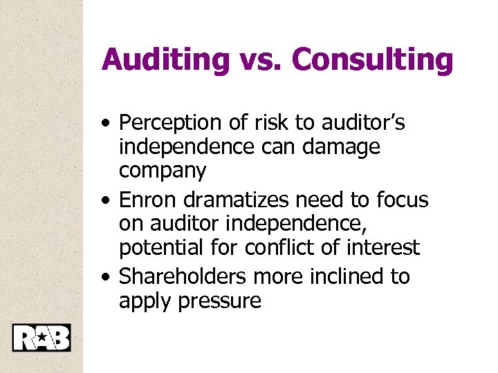 Auditing vs. Consulting • Perception of risk to auditor’s independence can damage company • Enron dramatizes need to focus on auditor independence, potential for conflict of interest • Shareholders more inclined to apply pressure