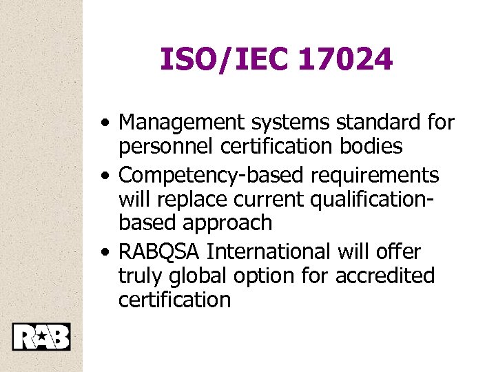 ISO/IEC 17024 • Management systems standard for personnel certification bodies • Competency-based requirements will replace current qualificationbased approach • RABQSA International will offer truly global option for accredited certification