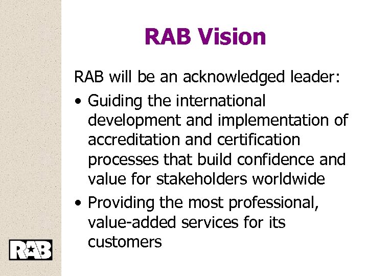RAB Vision RAB will be an acknowledged leader: • Guiding the international development and implementation of accreditation and certification processes that build confidence and value for stakeholders worldwide • Providing the most professional, value-added services for its customers