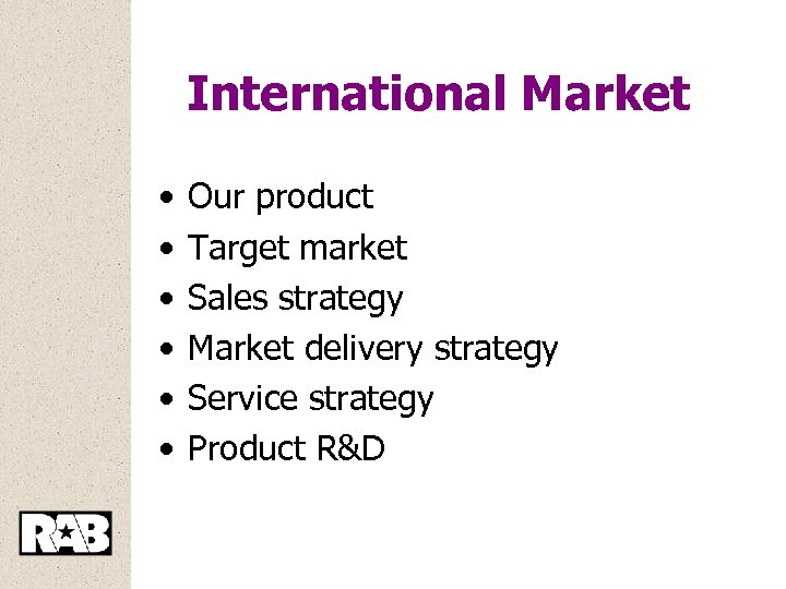 International Market • • • Our product Target market Sales strategy Market delivery strategy Service strategy Product R&D