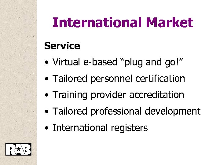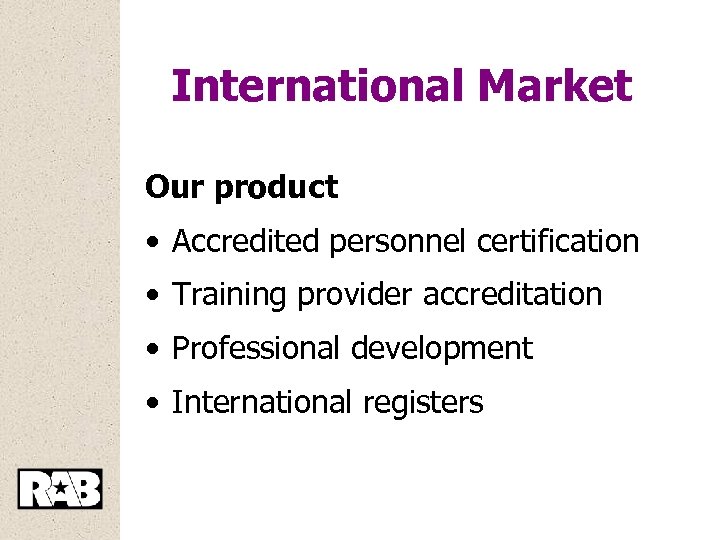International Market Our product • Accredited personnel certification • Training provider accreditation • Professional development • International registers