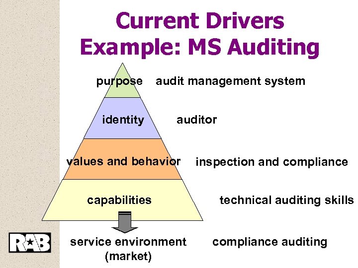 Current Drivers Example: MS Auditing purpose identity audit management system auditor values and behavior capabilities service environment (market) inspection and compliance technical auditing skills compliance auditing