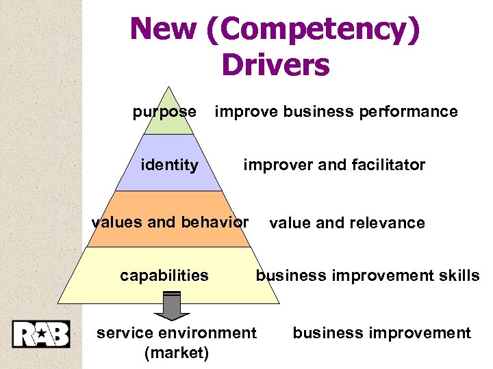 New (Competency) Drivers purpose identity improve business performance improver and facilitator values and behavior capabilities value and relevance business improvement skills service environment (market) business improvement