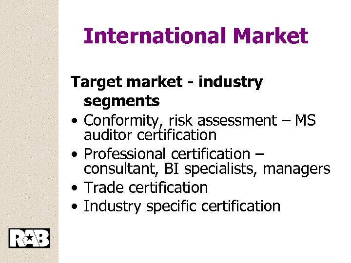 International Market Target market - industry segments • Conformity, risk assessment – MS auditor certification • Professional certification – consultant, BI specialists, managers • Trade certification • Industry specific certification