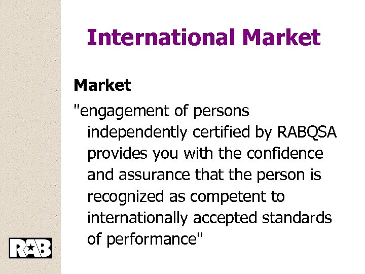 International Market "engagement of persons independently certified by RABQSA provides you with the confidence and assurance that the person is recognized as competent to internationally accepted standards of performance"