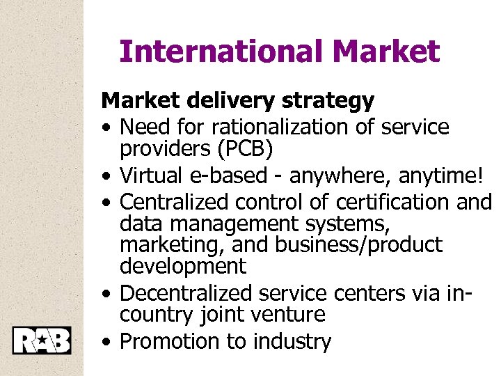 International Market delivery strategy • Need for rationalization of service providers (PCB) • Virtual e-based - anywhere, anytime! • Centralized control of certification and data management systems, marketing, and business/product development • Decentralized service centers via incountry joint venture • Promotion to industry