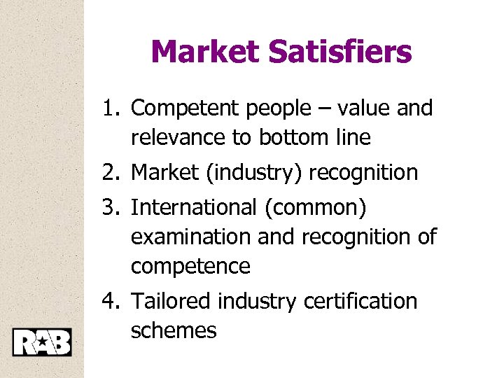 Market Satisfiers 1. Competent people – value and relevance to bottom line 2. Market (industry) recognition 3. International (common) examination and recognition of competence 4. Tailored industry certification schemes