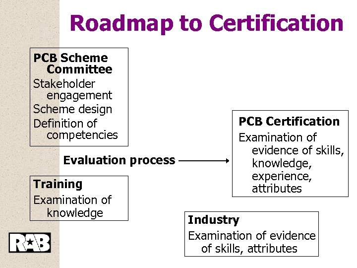 Roadmap to Certification PCB Scheme Committee Stakeholder engagement Scheme design Definition of competencies Evaluation process Training Examination of knowledge PCB Certification Examination of evidence of skills, knowledge, experience, attributes Industry Examination of evidence of skills, attributes