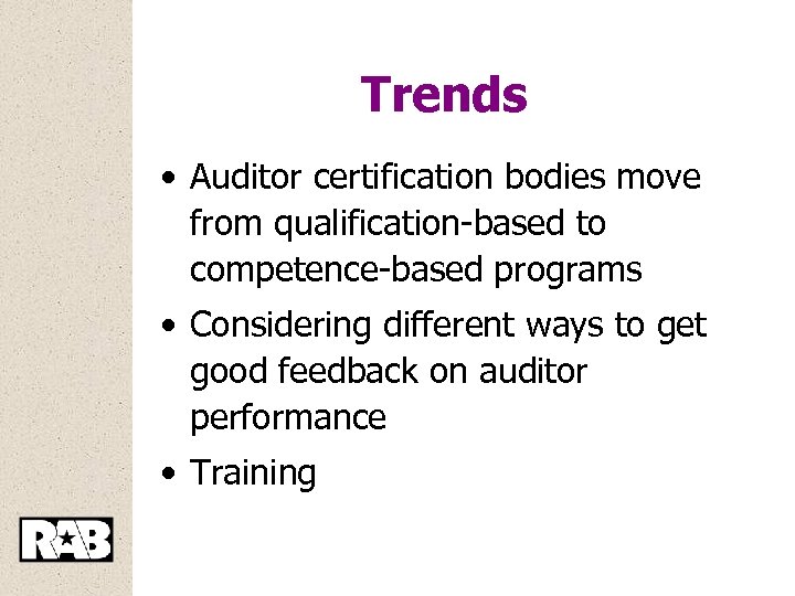 Trends • Auditor certification bodies move from qualification-based to competence-based programs • Considering different ways to get good feedback on auditor performance • Training