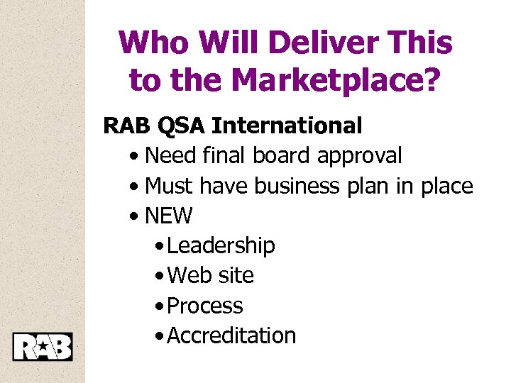 Who Will Deliver This to the Marketplace? RAB QSA International • Need final board approval • Must have business plan in place • NEW • Leadership • Web site • Process • Accreditation